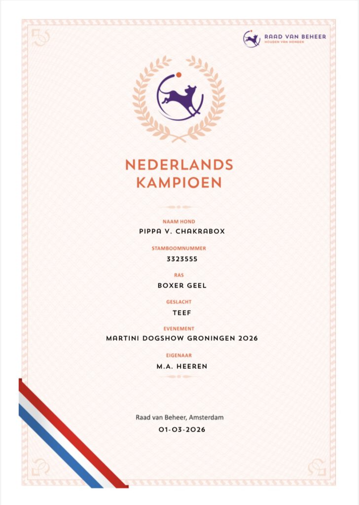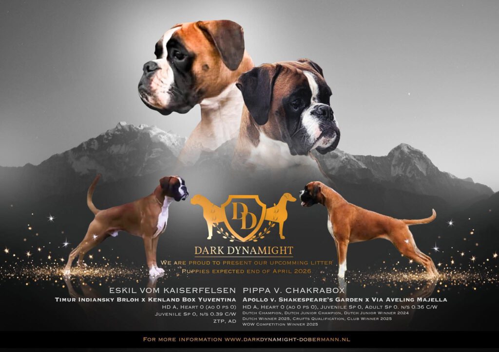 Als alles goed gaat, hoop ik begin 2026 een nestje boxers te krijgen van Pippa v. Chakrabox. Zij zal bij haar komende loopsheid gedekt gaan worden. Ook deze pups zullen in ons gezin geboren worden en in huiselijke kring worden grootgebracht. Voor meer informatie over dit nest, neem gerust contact met mij op.